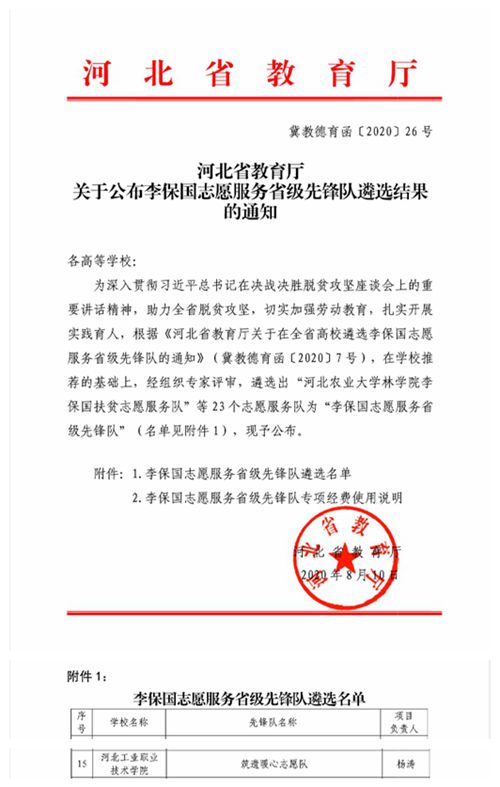 河北省教育厅关于李保国志愿服务省级先锋队遴选结果的公示
