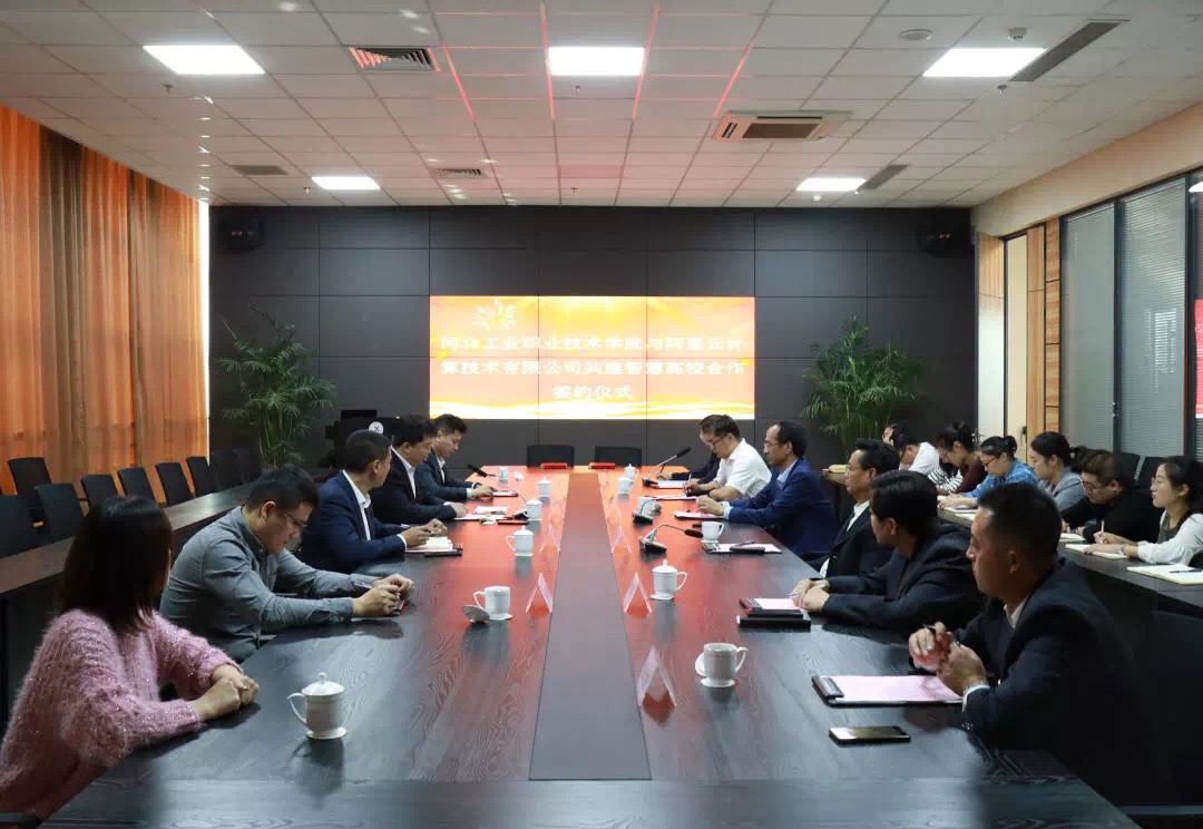 10月10月下午,我院与阿里云计算技术有限公司校企合作签约仪式在图文信息中心七楼会议室举行。学院党委书记王振杰、院长贾俊礼、计算机技术系相关负责人与阿里巴巴集团战略发展大区总经理李瑞华经理、阿里云智能河北分公司总经理李成龙经理等出席了签约仪式。