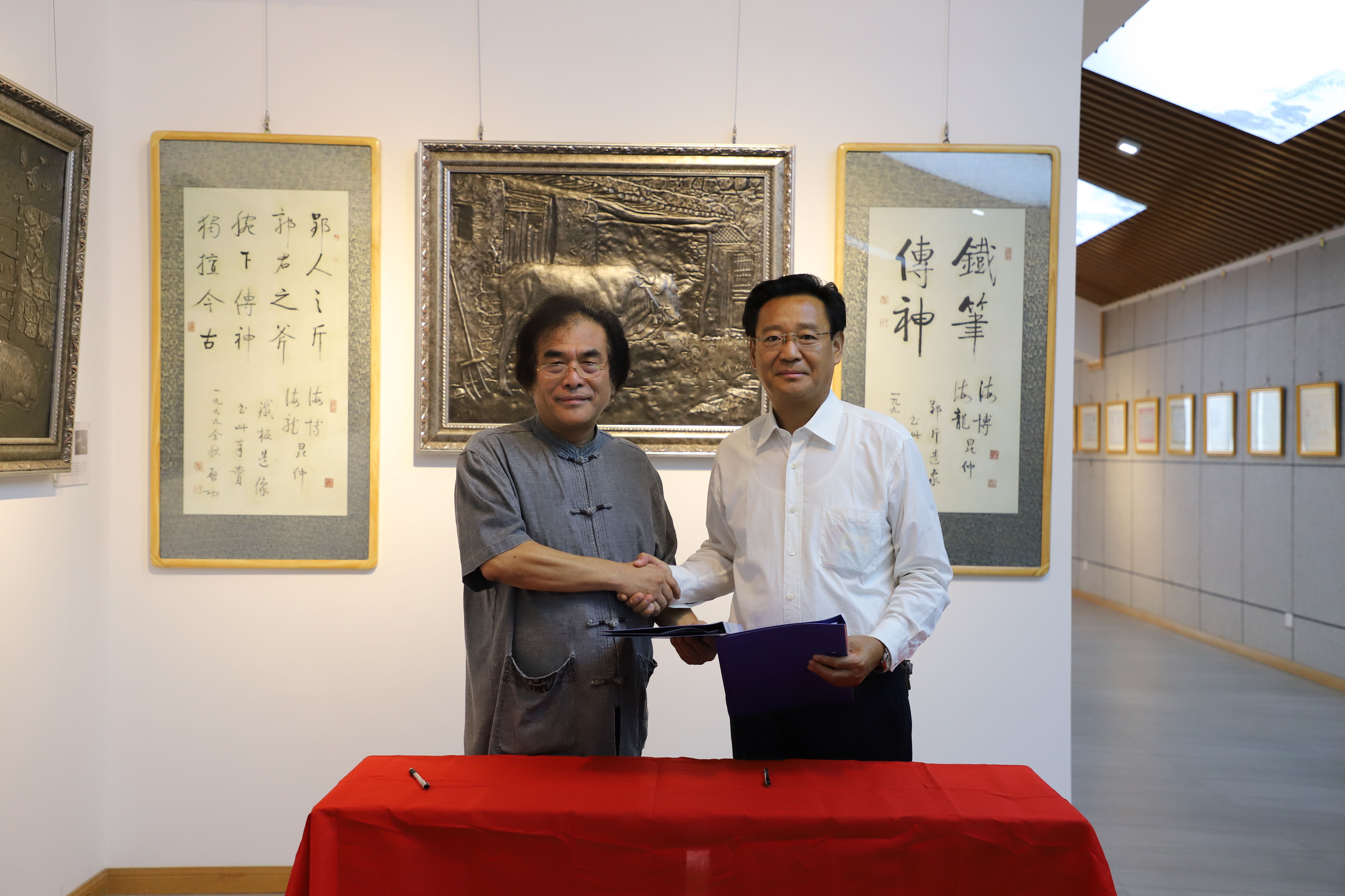 “保护、传承和创新民族传统工艺与非物质文化遗产,加强技术技能积累”是学院近年来拓宽办学思路和办学职能的特色做法。9月20日下午,学院院长贾俊礼、党委副书记王建刚来到学院“郭海博铁板浮雕艺术馆”,为郭老师送来“客座教授聘书”。