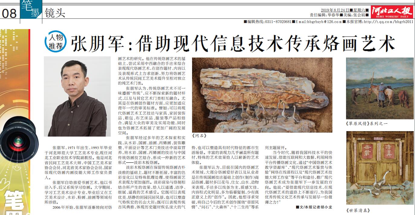 日前,《河北工人报》以《张朋军:借助现代信息技术传承烙画艺术》为题,对我院烙画艺术进行了深度关注与报道。