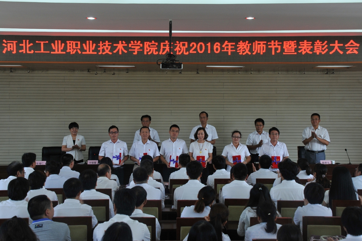 大会在庄严的国歌声中拉开序幕。贾俊礼院长宣读了获得2015年度河北工业职业技术学院先进党支部、优秀党务工作者、优秀共产党员、考核优秀集体与个人、优秀教师、优秀教育工作者名单,及2015-2016年度获得上级主管及相关部门表彰的先进集体和先进个人名单,并对先进集体、个人进行了表彰。学生代表夏佳豪、苏苏代表全院同学献词,向广大教师致以衷心的敬意和节日的祝福;工商管理系王文娟老师作为优秀教师代表发言,感谢学院为广大教师创造的良好工作学习和生活环境,表示将继续努力,爱岗敬业、严谨笃学,为学院进一步发展贡献力量。