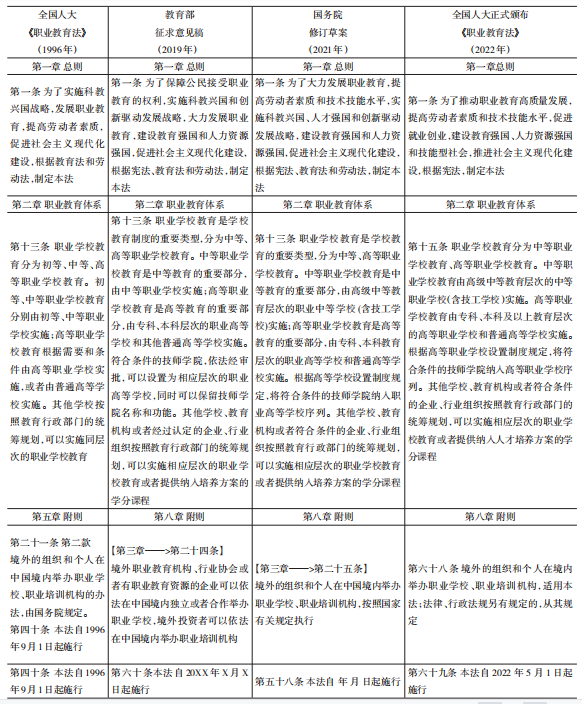 至此,历经近14年的修订终于划出了一个圆满的句号。综上,《职业教育法》修订过程,历时长,路曲折,有反复,来之不易。整个历程比想象和预期要缓慢和困难得多,一茬茬起草组,一个个研究团队,一次次咨询会、座谈会、研讨会,走访、考察,质疑、争鸣,一份份报告、论文、文件、建议,从中央、省、市县,到政府、人大、政协和社团,涉及教育、人社和行业多部门,院校和企业,官员、学者和基层工作者,林林总总介入,方方面面参与,条条款款修改,一稿又一稿,14年磨一剑,千呼万唤始出来。笔者也分析过对《职业教育法》修订的边界、思路、框架和内容等不同看法,如修法有没有必要,是必须改还是可以不改?是快改还是慢改?修法尺度有多大,是大改、中改、还是小改?修法大体什么框架,几章多少条反映了什么?修法有何新立意,怎样体现与时俱进?关注新《职业教育法》修订过程,就是要分析其增加、修改、删掉的章目、条款和表述,其背后的与时俱进的思想和立意及创新策略和举措。每一次修改,都体现了越改越切合实际,越改越明,越改越高,越改越新,越改越深刻,越改越提振信心。举个例子,关于立法的依据。原法是“根据教育法和劳动法”,教育部送审稿改为“根据宪法、教育法和劳动法”,到全国人大审议通过文本定为“根据宪法,制定本法”,改的过程,其力度、高度和重要地位的体现不言而喻。下边列表再举例说明:1996年《职业教育法》、2019年教育部《征求意见稿》、2021年国务院《修订草案》、2022年全国人大正式颁布《职业教育法》,四版(以个别章条为例)修改前后对照表(表1)。