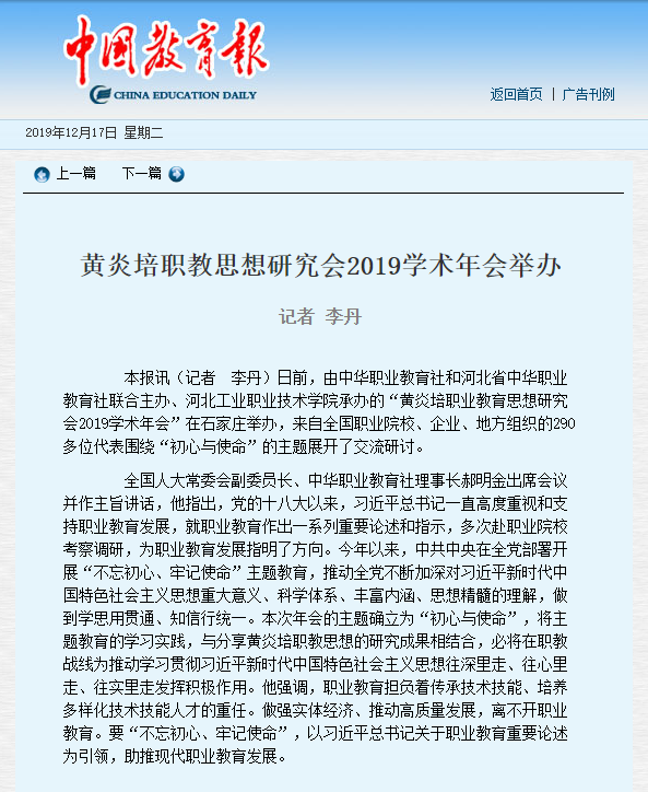 《中国教育报》报道黄炎培职业教育思想研究会2019学术年会在我院举办