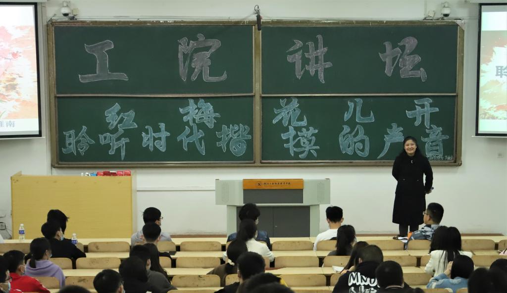 讲座伊始,高老师现场演唱了歌曲《红梅赞》。“红梅花儿开,朵朵放光彩,昂首怒放花万朵,飘香云天外……”振奋人心的歌声开启了本次讲座的主题,引出了“什么是时代楷模”这一问题。接着,高老师详细介绍了本次讲座的主人公——张桂梅,她爱岗敬业、爱生如子、执着奋斗、无私奉献的精神深深感动了大家。她教会了大山里的女孩用知识改变命运,她用教育事业,为阻断贫困的代际传递付出一生。最后,高老师讲述了《红梅赞》的创作背景与发展历程,并带领同学们合唱《红梅赞》选段,用歌声再次表达了对时代楷模的敬仰之情。