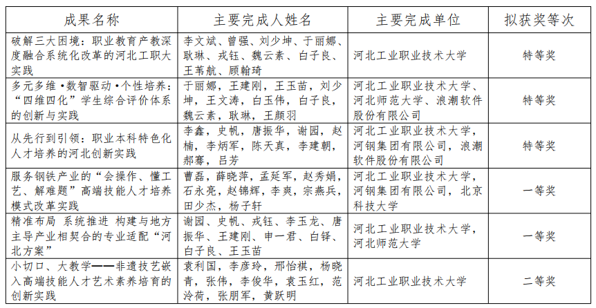 近日,省教育厅向我单位反馈了2025年职业教育河北省教学成果奖拟获奖项目。我单位推荐的项目共入选6项,其中特等奖3项、一等奖2项、二等奖1项。