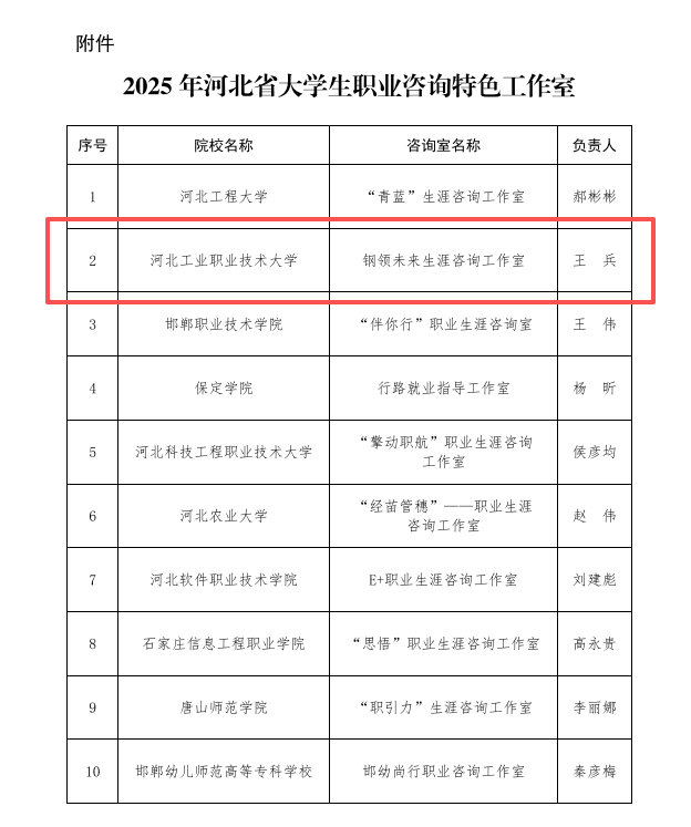 省教育厅于4月份发布遴选通知,经高校申报、专家评审和实地调研等程序,最终确定了10个咨询室为2025年河北省大学生职业咨询特色工作室。