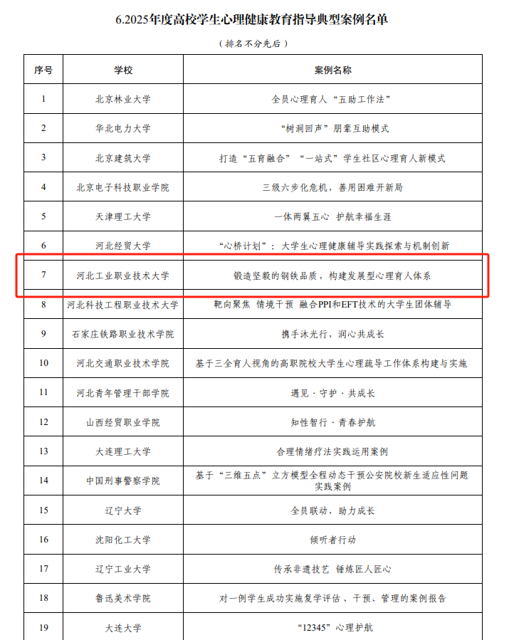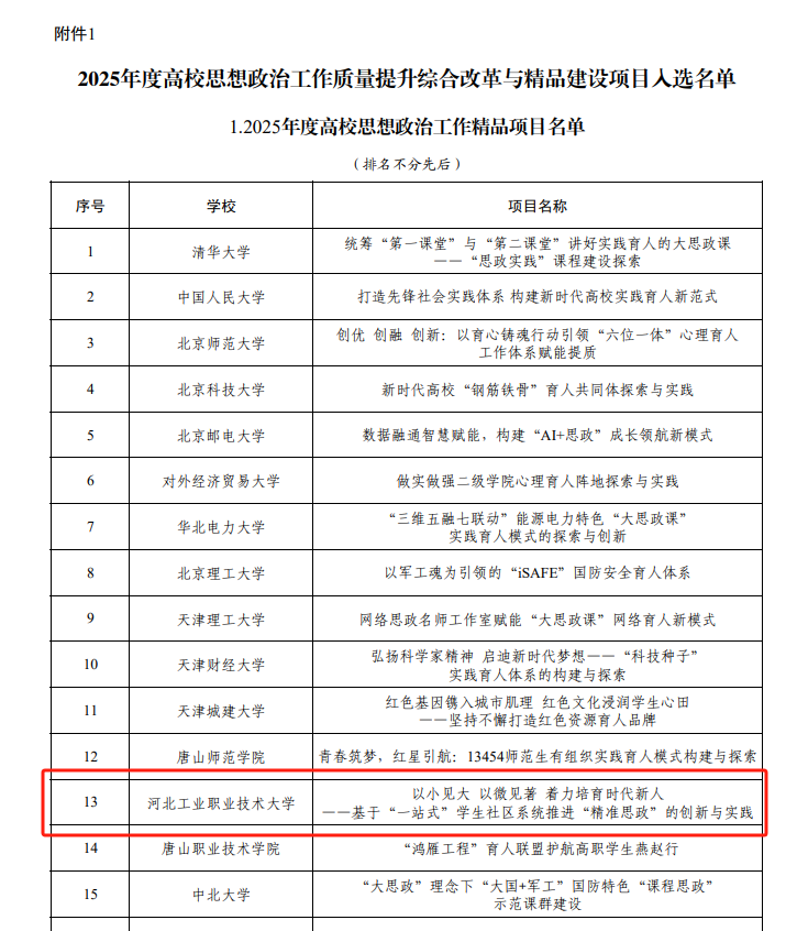 近日,教育部公示了2025年度高校思想政治工作质量提升综合改革与精品建设项目遴选结果,我校3个项目入选。其中,《以小见大 以微见著 着力培育时代新人——基于“一站式”学生社区系统推进“精准思政”的创新与实践》入选高校思想政治工作精品项目,《锻造坚毅的钢铁品质 构建发展型心理育人体系》入选高校学生心理健康教育指导典型案例,学校“一站式”学生社区入选全国高校示范“一站式”学生社区。