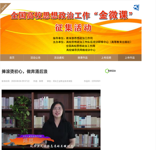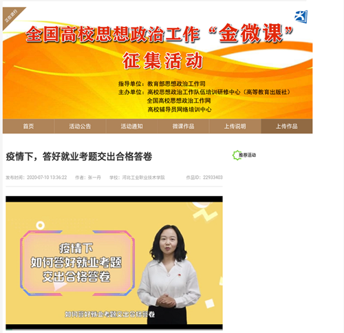 日前,我校推选的两部微课作品《疫情下,答好就业考题交出合格答卷》《捧滚烫初心 做奔涌后浪》入选全国高校思想政治工作网“金微课”栏目,这是在新时期下,我校创新思政教育方式、推动精品思政微课建设的一次有益探索与实践,也是一次面向社会的直观展示。