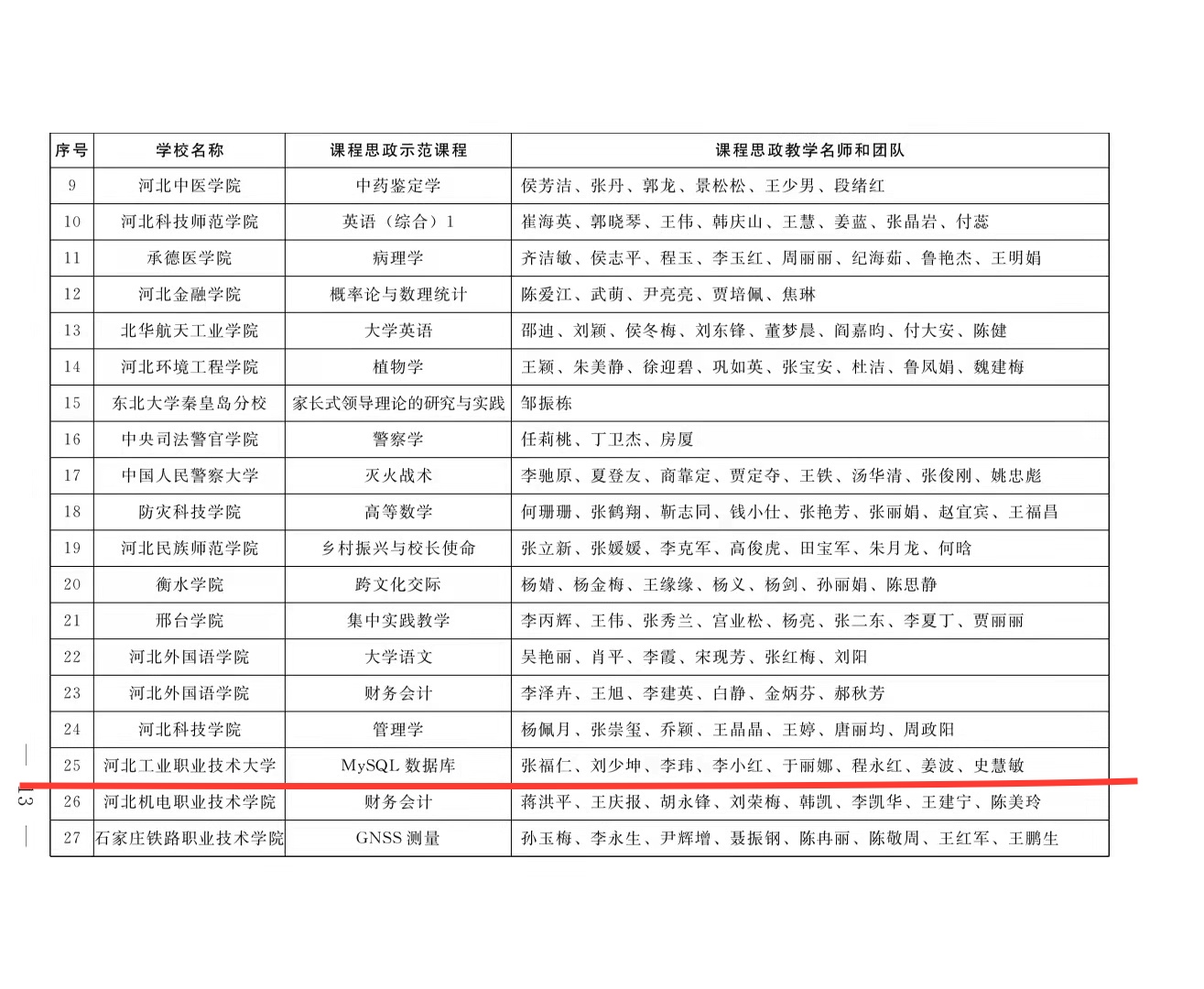 近日,省教育厅公布了河北省课程思政示范项目建设名单。我校申报的继续教育类课程《MySQL数据库》入选。该评选是根据《河北省教育厅关于开展课程思政示范项目建设工作的通知》要求,深入实施《高等学校课程思政建设指导纲要》,开展的课程思政示范课程、教学名师、教学团队和教学研究示范中心评选工作。
