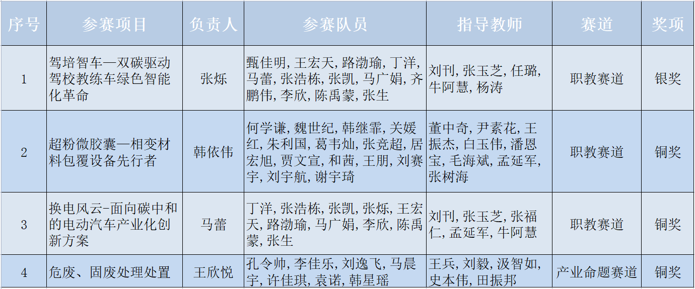 2023年2月20日中国国际“互联网+”大学生创新创业大赛组织委员会对第八届中国国际“互联网+”大学生创新创业大赛获奖名单进行了公示,我校汽车工程系“驾培智车—双碳驱动驾校教练车绿色智能化革命”项目荣获职教赛道国赛银奖。材料工程系“超粉微胶囊--相变材料包覆设备先行者”项目,汽车工程系“换电风云”项目,环境与化学工程系“危废、固废处理处置”项目均斩获国赛铜奖。