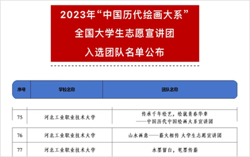 为深入学习贯彻落实习近平文化思想,推动中华优秀传统文化的传承发展和国际交流,团中央青年志愿者行动指导中心、教育部中外语言交流合作中心等联合发布了关于遴选2023年“中国历代绘画大系”全国大学生志愿宣讲团的公告,最终我校三支宣讲团入选。