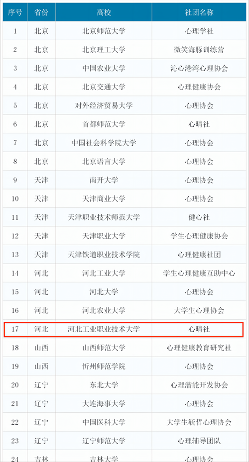 近日,由共青团中央、中华全国学联秘书处、中国青年报社联合开展的“全国高校学生心理健康社团”寻访活动结果公布,我校心晴社入选共青团中央直接联系、跟踪培养的高校学生心理健康社团,同时我校也是河北省唯一入选的职业院校。