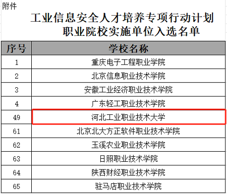 近日,工业和信息化部教育与考试中心公布了“工业信息安全人才培养专项行动计划”入选单位共65所职业院校,我校成功入选。