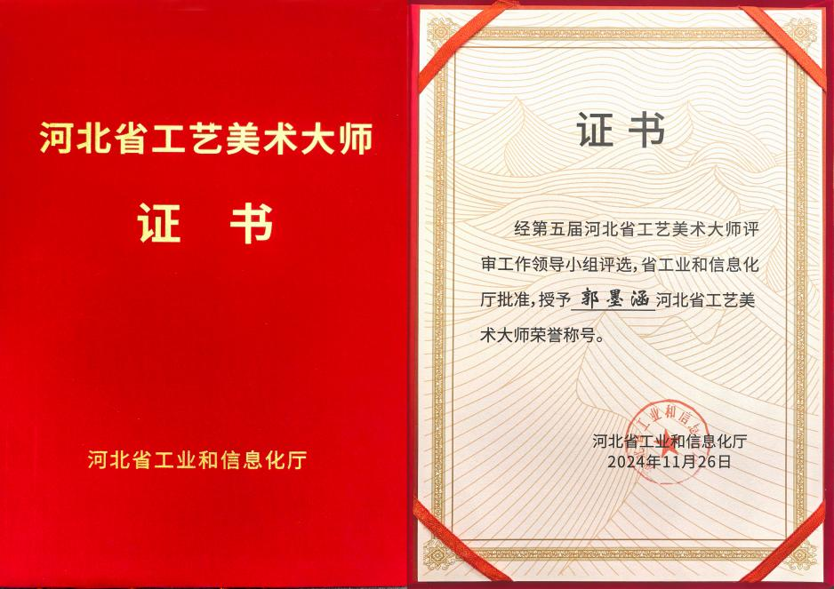 “河北省工艺美术大师”每4年评审一次,是报省政府批准,省工信厅牵头,由河北省工艺美术协会具体组织,授予河北省工艺美术创作者的荣誉称号。经过层层选拔,严格评比,全省各市(区)申报推荐、资料审核、专家评审、审议公示等环节。郭墨涵以精湛的技艺在430位参评者,1300多件作品中,以金属组第一名的好成绩脱颖而出,荣获第五届河北省工艺美术大师称号。