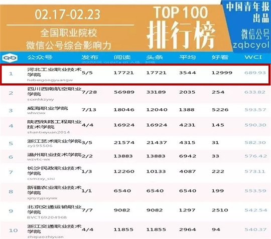2月25日,在中国青年报发布的最新一期(2月17日—23日)全国职业院校微信公众号综合影响力排行榜中,我院官方微信公众号以高达689.93的WCI综合影响力指数登顶榜首,这也是学院官微自开通以来首次登顶全国职业院校微信公众号综合影响力排行榜。学院官微同期位居“河北发布”公布的河北省高校微信榜单周榜第一名。