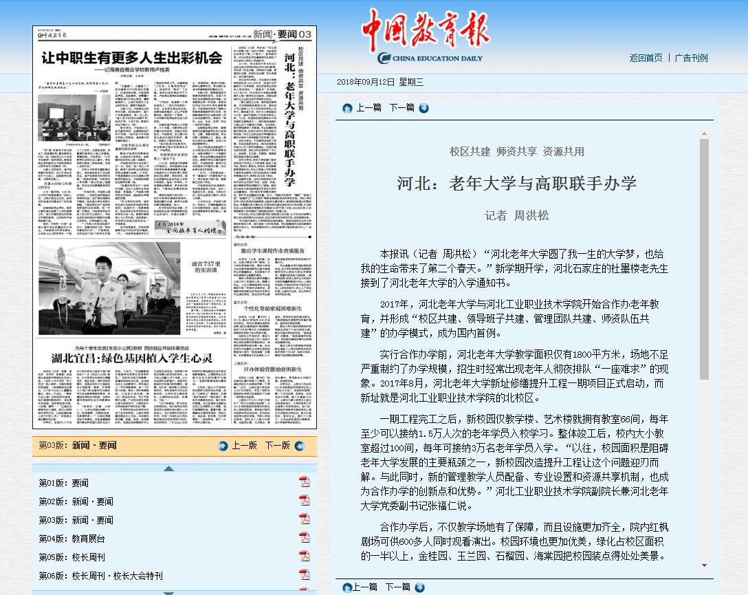 日前,《中国教育报》对我院与河北老年大学以“校区共建、领导班子共建、管理团队共建、师资队伍共建”的办学模式合作开办老年教育进行了深度关注与报道。