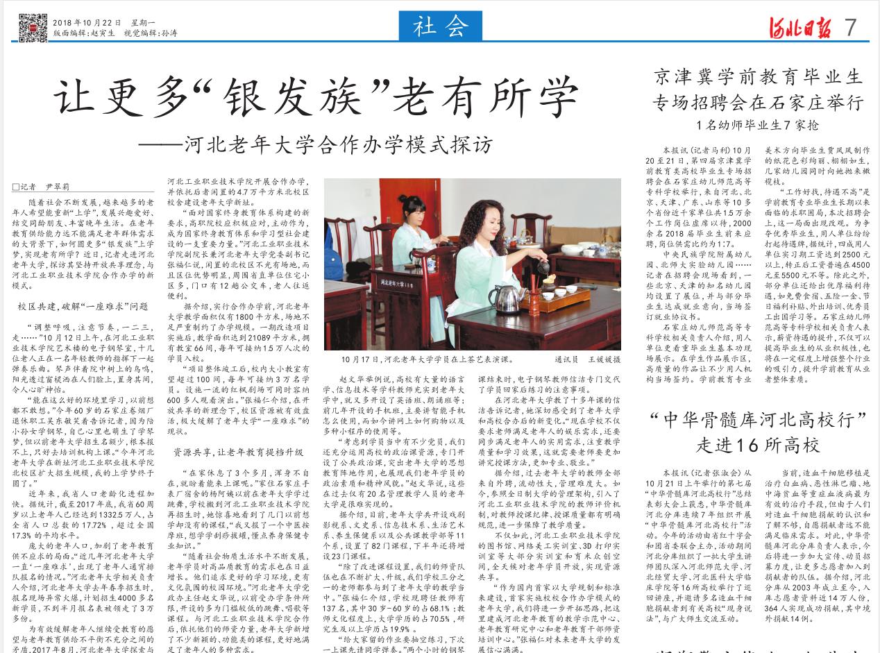 日前,《河北日报》以《让更多“银发族”老有所学》为题,对我院与河北老年大学合作办学模式进行了深度关注与报道。