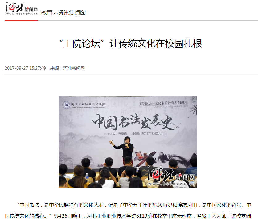 9月27日,河北新闻网以《“工院论坛”让传统文化在校园扎根》为题对我院三亿(中国)讲坛——“工院论坛”开展情况进行了报道。