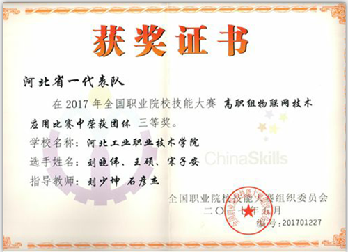 5月9日,由教育部举办的2017年全国职业院校技能大赛总决赛在天津轻工职业技术学院结束,我院学生组成的代表队,作为河北省一队参加了“物联网应用技术”赛项,并取得三等奖。