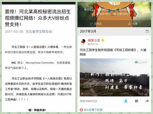 魏鸿影音工作室自2014年成立以来,一直以摄影、微视频制作为主要实践内容,2016年在自媒体平台及优酷视频首次制作的网络校园街坊《卜卜眼》第一季以50万点击量完美收官,获得学生群体的极大关注;2017年在学院支持下,以“服务青年、引领思想”为宗旨策划的微视频《我们正青春》将联手新浪微博,助力学生成长;同时制作包含文艺、青春、娱乐、以及贴近于学生的事实话题电台栏目《花生奶糖》通过微信公众账号的形式进行推送,节目一经播出就获得许多同学的认可,并得到上千名同学的转发及点赞。而此次,魏鸿影音改编网络红人节目制作《一人我报志愿》以招生季为背景、用诙谐的画面表现形式结合神曲般的节奏爆红网络,获得河北省学生联合会微信公众平台的发布,3月27日上线仅一天播放量达到10万,被称为“工院神曲”。