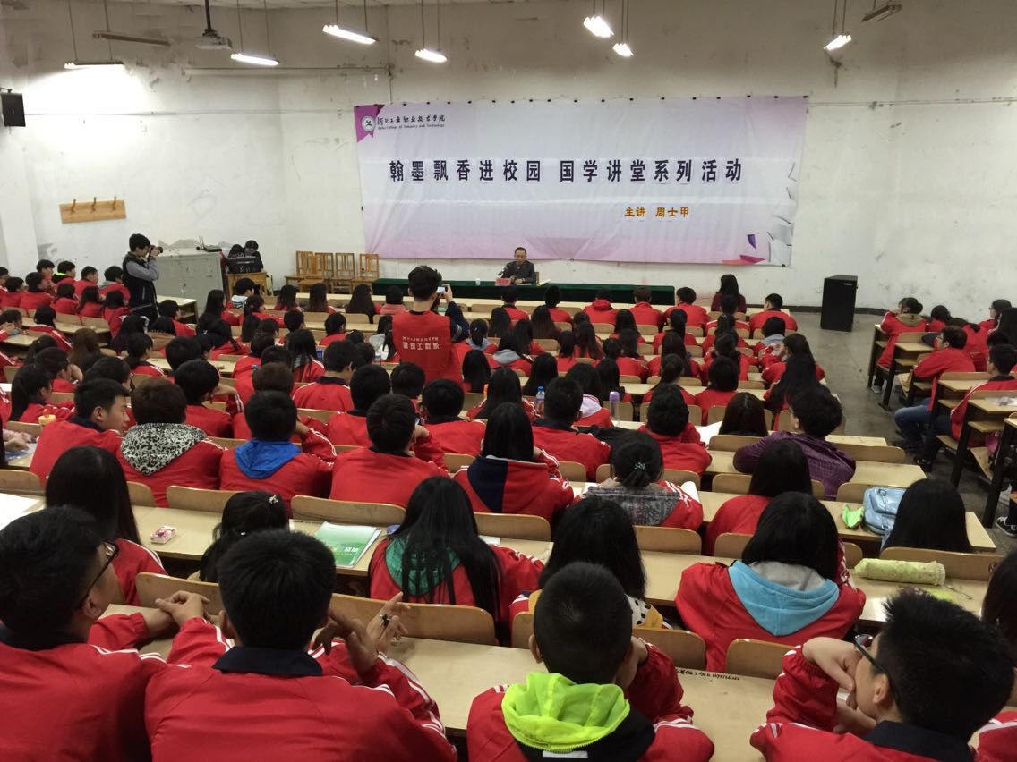 3119教室里座无虚席,河北省书画艺术研究院理事、河北省书法家协会会员周士甲老师正在为同学们讲授题为“前进之光——学国学的生活意义”国学讲座。周老师从“国学”入手谈及“时尚”; 以“国学”根源为出发,分享了先秦经典及诸子学为根基,涵盖两汉经学、魏晋玄学、宋明理学和同时期汉赋、六朝骈文、唐宋诗词、元曲与明清小说、历代史学等一套特有而完整的文化、学术体系在生活中的意义;用“国学”引导大家了解中国传统文化精髓与当代文化精华的融合和“中国梦”的具体体现。在场同学无不被“国学”所深深吸引,纷纷感叹中华传统文化的博大精深。