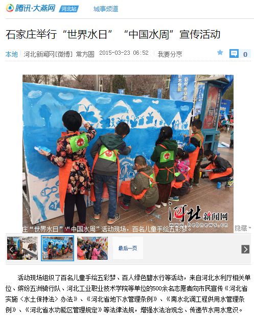 为了呼吁石家庄市民节约水资源,形成爱水护水的意识,3月22日,我院环境与化学工程系的青年志愿者应邀参加了由河北省水利厅、石家庄市水务局和河北省乐水志愿者协会联合举办的“世界水日”系列活动。河北电视台、燕赵都市报、腾讯·大燕网、长城网、河北新闻网等媒体对此次活动进行了跟踪报道。