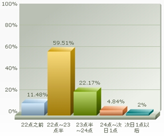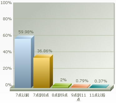 近年来,随着手机、平板电脑等便携式移动终端的普及,人们的临睡前生活愈加丰富,导致睡眠时间的推迟是个不争的事实,大学生群体更难“豁免”。通过问卷调查发现,当面对“您晚上一般几点休息?”这一问题时,众多学生显示出“晚睡”的倾向。从图1所示的数据中可以看出,大部分同学就寝时间均集中在22点到23点半,占总人数的59.51%。对“您每天大约几点起床?”问题的回答(图2)显示出绝大部分的同学选择在早上“7点以前”和“7点到8点”的时间段起床,但是有近0.37%的同学选择了上午11点后起床。