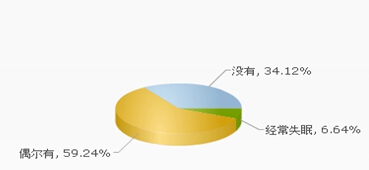 问卷中关于“睡眠质量”设置了调查问题,并得到了反馈结果。例如同学们在回答“您有失眠的问题吗?”时(图5),表示“没有过失眠”的同学有34.12%,“经常失眠”的有6.64%,而“偶尔失眠”的同学则占了多半数。睡眠质量对白天的精神状况会直接产生影响,因此,回答“如果没睡好,第二天上课会怎么样?”时,大部分的同学都表示在上课时会“偶尔想睡”,“精神不好”。