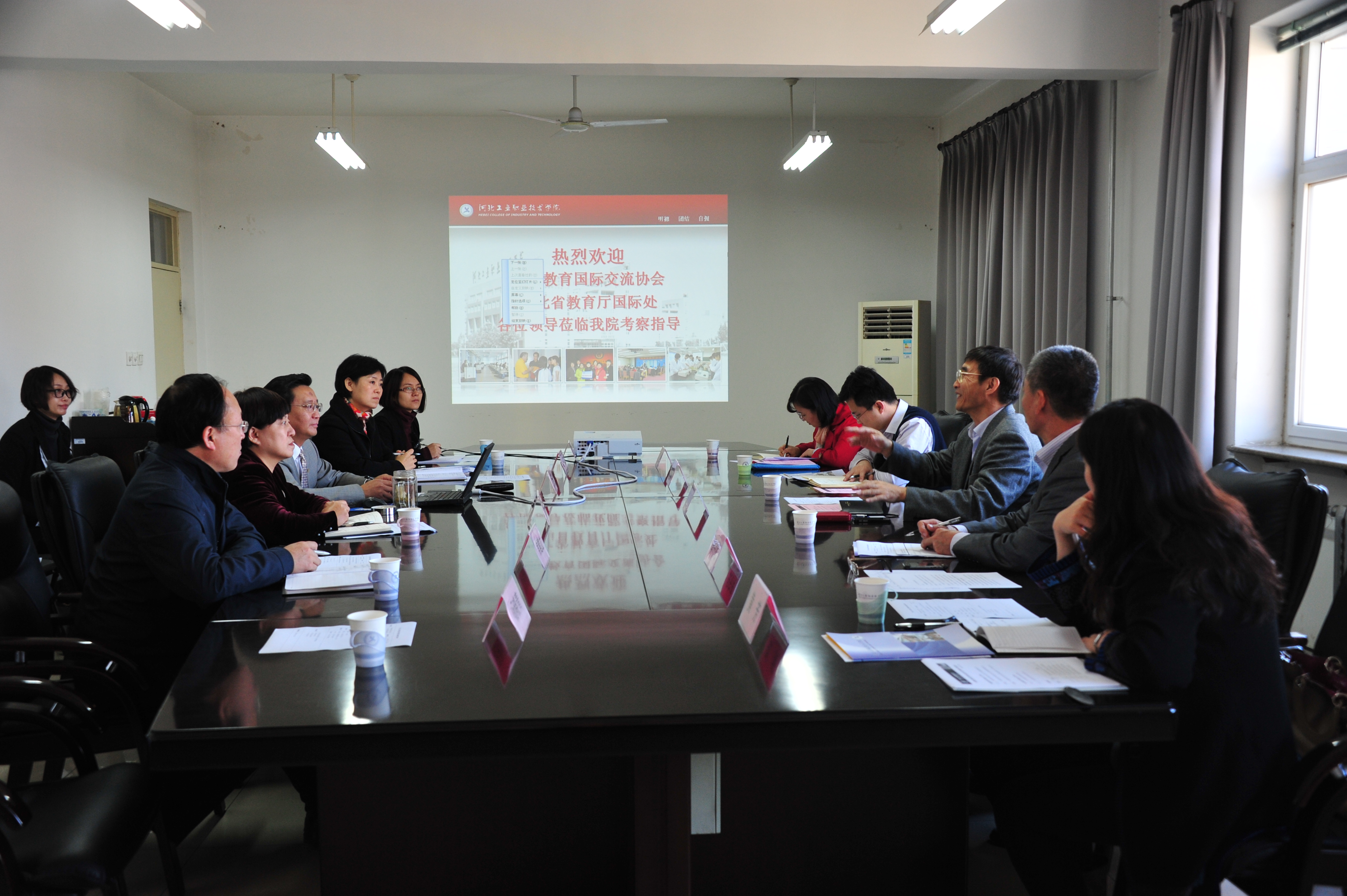 11月3日受教育部国际司委托,中国教育国际交流协会涉外办学质量保障部宗钢主任等一行三人,在河北省教育厅李守民副处长陪同下对我院合作办学情况进行调研。贾俊礼院长,付俊薇副院长、合作办学专业教师和国际交流中心教师参加调研座谈。