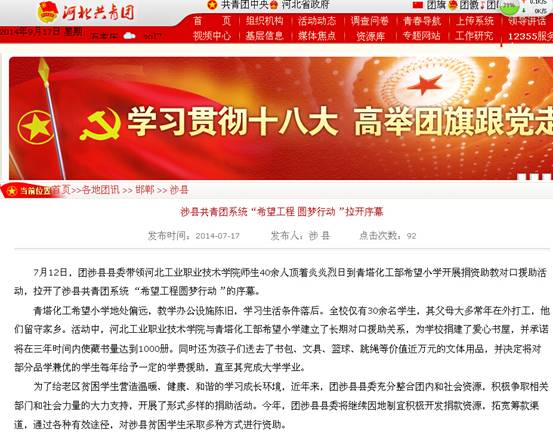 小分队与青塔小学建立长效机制伊始,就得到涉县县委、共青团河北省委的高度关注。涉县团委书记全程参加了对口支援活动,共青团河北省委并且以“希望工程圆梦行动”为题进行了报道。而深入开展暑期社会实践,建立对口帮扶长效机制也是学院进一步培育和弘扬社会主义核心价值观,增强大学生的社会责任感、创新精神和实践能力进行的有益探索。在今后的学生社会实践工作中,我们将努力深入工作,将服务目光转向基层、关注贫困山区、关注贫困儿童、解决实际问题,为解决贫困山区儿童求学的社会问题尽微薄之力。