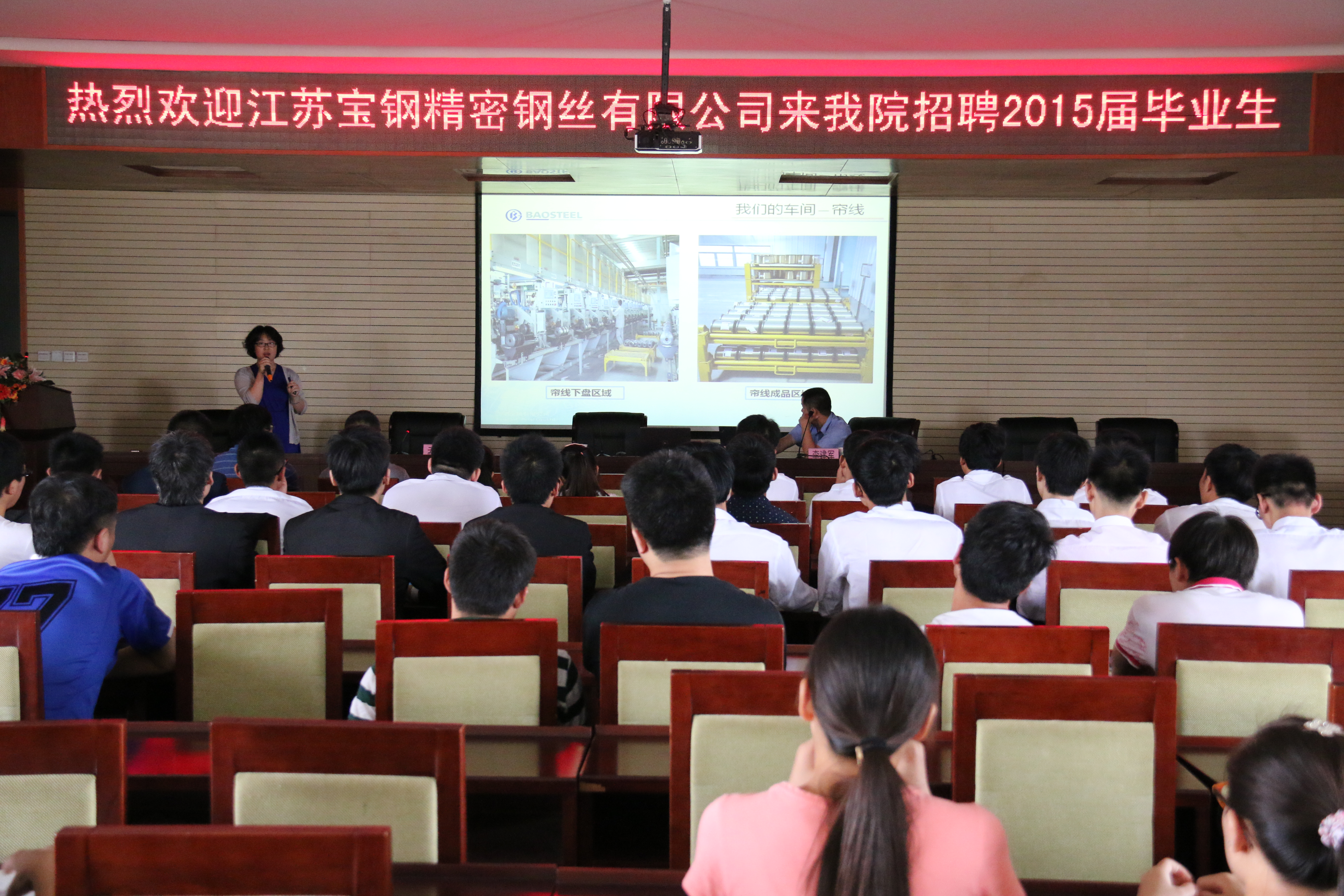 近日,江苏宝钢精密钢丝有限公司副书记兼综合部部长周婕一行三人来我院招聘2015届毕业生,该公司是首次与我院合作,是我院今年新开发的知名企业之一,招聘专业涉及冶金材料类、电气类、机械类等工科类专业,经过宣讲、初选、面试,最终有21名毕业生被录用,这部分被录用的学生将利用暑期从7月14日—26日在我院进行为期两周的上岗培训,培训结束直接到单位进行顶岗实习,同时对培训后合格的学生,公司将为每位学生提供第三年学费补贴(5000元/人)。