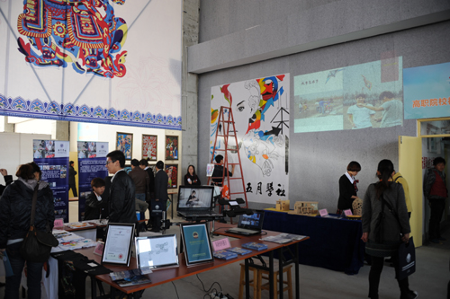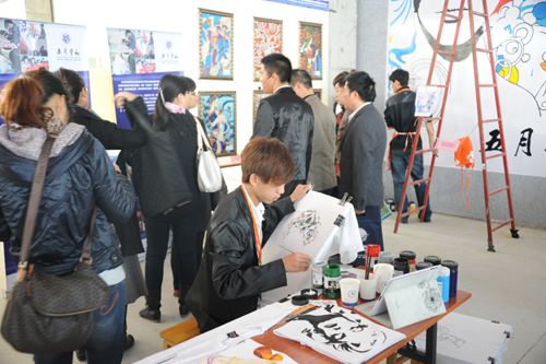 我院五月学社的部分同学以社团形式参加了此次展示会,会上静态展示了优秀学生作品如陶艺、装饰画、T恤、建筑模型等室内陈设品,动态的“笔记本电脑床用托架专利产品”展示、“T恤现场绘制”和“墙体彩绘”吸引了广大与会人员的高度关注;我院学生经过2天现场绘制,一幅幅带有我院校名和五月学社社名的美丽作品跃然墙上,引来众多与会领导、老师和学生驻足观看,并合影留念。最终,我院社团展示以第一名的好成绩获得“最具人气奖”。