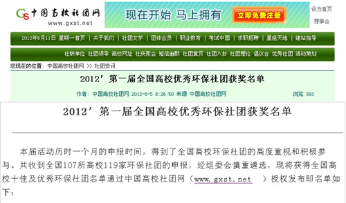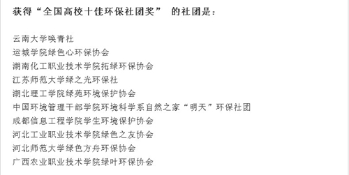 在“第一届全国高校优秀环保社团”评选中,我院绿色之友协会荣获“全国高校十佳环保社团”称号。