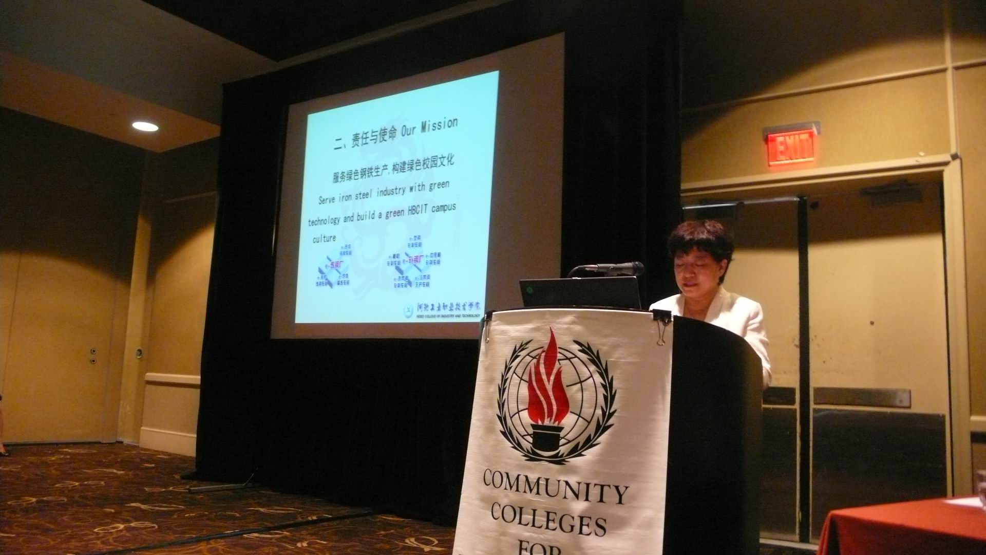 会上,董书记委派付俊薇副院长向大会做了交流发言。付院长的发言题目是“服务绿色钢铁生产,构建绿色三亿(中国)”,内容共分学院与团队介绍、责任与使命、见闻与思考、启示与收获四个部分。付院长着重向与会代表介绍了学院在国家示范高职院校建设中取得的一系列不平凡成绩和本次在美国培训、考察的收获、思考以及回国后的工作设想。付院长的发言得到了大会的一致好评,会后多位美国社区学院的代表专门找到董书记、付院长就有关问题进行进一步的探讨和交流。