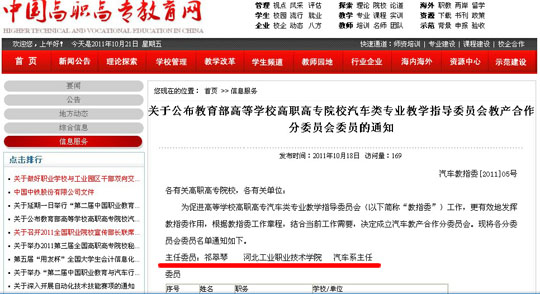 2011年10月18日,我院机电工程系主任祁翠琴教授被聘为教育部高等学校高职高专院校汽车类专业教学指导委员会教产合作分委员会主任,将受教育部委托,协助汽车教指委开展汽车类专业教产合作的研究、咨询、指导、评估、服务等工作。