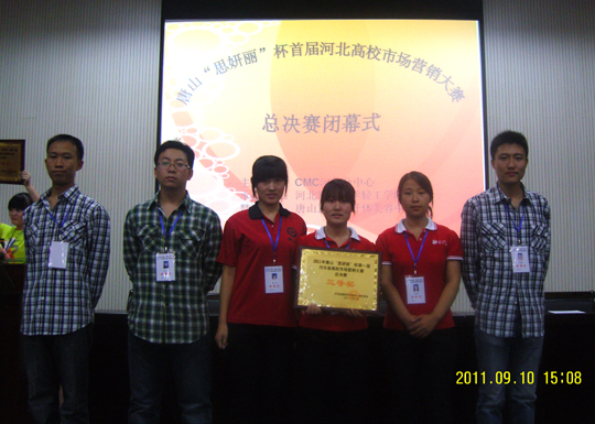 9月7日至10日,由中国市场营销专业课程标准开发中心(CMC)河北分中心主办,河北联合大学轻工学院承办的2011年第四届全国高校市场营销大赛河北省赛区总决赛暨唐山“思妍丽”杯首届河北省市场营销技能大赛总决赛圆满结束。我院工商管理与贸易系2010级市场营销专业杨阳、尹渊章、张向、郭子娆、魏硕、武凯旋等6名学生组建的Hometown Juice和King Square代表队经过激烈角逐,荣获省级三等奖。