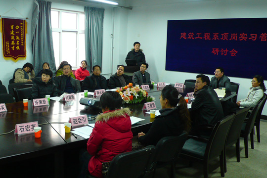 12月16日下午,我院学生顶岗实习管理学术研讨会在建筑工程系召开,冀科监理公司王建路总经理、石家庄三建建业集团有限公司梁士新总工程师、河北宝胜建筑有限公司工程张立波部长三位企业专家应邀参加讨论,教务处、七系代表及建筑工程系全体教师参加了会议。