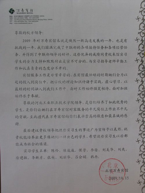 此次专业顶岗实习的校外实训基地均是管理正规严格、具有较高档次的知名酒店企业,主要有中共中央对外联络部直属的北京万寿宾馆(四星级)、民政部直属的秦皇岛金海苑酒店、河北省政府直属的河北中国大酒店(四星级)和天津百饺园餐饮投资有限公司等。在六个月的实习中,学生们态度端正、做事积极主动、虚心好学、吃苦耐劳、任劳任怨、不怕脏、不怕累,服从酒店管理,圆满完成了分配任务,受到了实习单位的一致好评。实习单位于近日纷纷来电来函,对优秀实习生进行褒奖,对我院旅游管理专业办学取得的成绩表示祝贺,一些实习单位已经同表现优秀的实习生达成了就业意向。