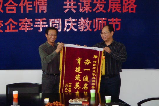 贾俊礼常务副院长首先对企业来宾的来访表示欢迎,并向来宾们介绍了我院的历史和近几年学院各方面的迅猛发展,对一直与我院倾力合作的企业表示感谢,同时向老师们表示节日的祝贺。在肯定了建筑工程系近两年的工作成绩的同时,赞扬了建工系教师在教育工作中兢兢业业、无私奉献,对建工系一直开展的校企合作、工学结合的教育理念和与企业共谋发展、互利共赢的合作原则给予了肯定,希望建工系在今后的教育教学工作中继续再接再厉、再创辉煌,在课程建设、校企合作方面继续创造新的成绩。