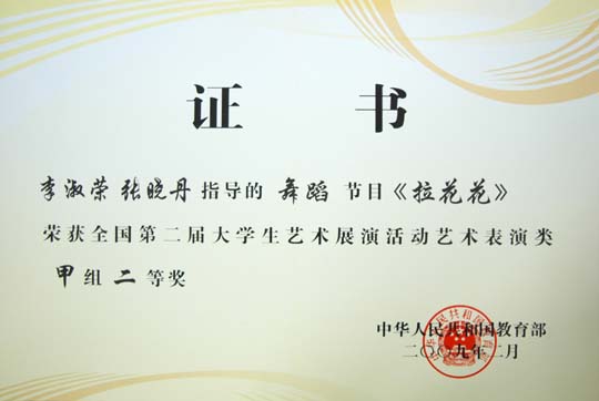近日,由教育部主办的全国第二届大学生艺术展演活动落下帷幕,我院取得优异成绩。教育部授予我院“全国第二届大学生艺术展演活动优秀组织奖”荣誉称号;由李淑荣、张晓丹指导的舞蹈节目《拉花花》荣获本届艺术展演活动艺术表演类甲组二等奖。