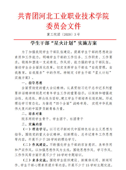 为锻炼和塑造一支成绩优、作风好、能力强的河北工院学生干部队伍,切实发挥学生干部在“自我教育,自我管理,自我服务,自我监督”中的作用,12月18日,我院学生干部宣誓任职仪式暨“星火计划”实施启动大会成功举办。学工部相关负责老师、2019级院系两级学生干部、2020级新生代表参加了本次大会。