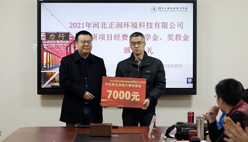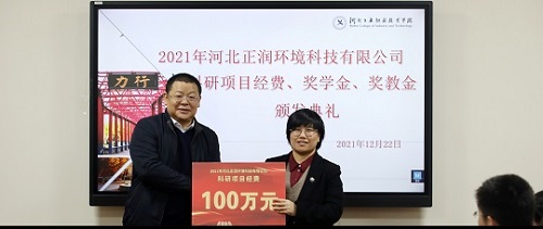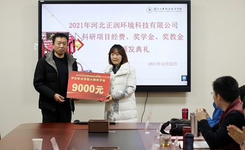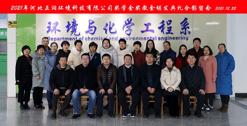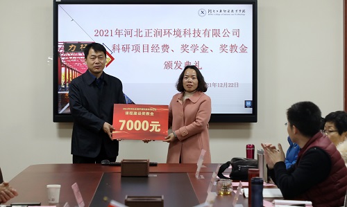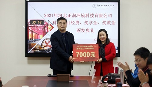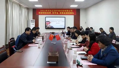 2021年12月22日河北正润环境科技有限公司科研项目经费、奖学金、奖教金颁奖仪式在我校举行。河北正润环境科技有限公司董事长胡晓波、副总经理任钢、行政管理中心总经理石书昌、工院云检测总经理赵树慈,我校三亿网站指导中心、环境与化学工程系相关负责人及获奖教师、学生代表参加仪式。