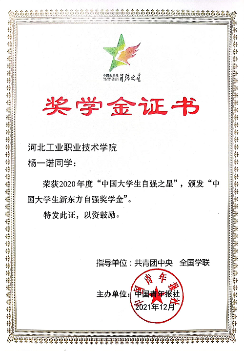 近日,在共青团中央、全国学联等部门联合开展的2020年度“中国大学生自强之星”寻访活动中,我校工商管理系杨一诺同学荣获2020年度“中国大学生自强之星”。