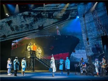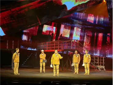 该剧中身临其境的舞台呈现方式让人眼前一亮,三块大型屏幕与活动组合的楼梯装置以色彩明暗的变化折射出收购前后斯梅代雷沃钢厂的巨大反差。从一开始火花四射的生产环境、冒着黑烟的厂房、遍布铁锈的落后设备,到后来的蔚蓝天空、现代化设备、电子化生产,都在讲述收购后钢厂在技术升级、环境治理方面的卓有成效。这部剧传达出来的已不是人们传统印象中工业题材实景呈现的钢花飞溅的钢铁厂,而是一种融合、先进、有着深厚情怀和感情交流的现代化工厂样貌。