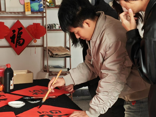 活动当天,同学们在规定时间到达指定地点,到场后先领取斗方福字纸,在专业指导老师的讲解示范下,大家尽情发挥创意,书写独属于自己的福字作品,书写完成后同学们自行带回留念。活动结束后,大家主动清理场地,将使用过的书写桌椅全部擦拭干净并归位摆放整齐,仔细清扫地面,无纸屑、墨渍残留。对毛笔、墨汁、砚台等书写工具以及剩余的物资进行全面清点,按原位全部摆放整齐。