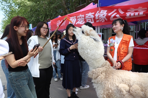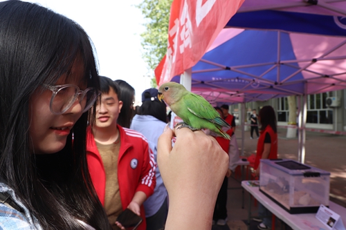 活动现场,萌宠天团集体亮相。憨态可掬的羊驼带着标志性“无辜脸”,吸引众人目光;雪白的宠物兔穿梭似绒球,触感柔软令人着迷;玄凤鹦鹉歪头卖萌,可爱模样直击人心;鬃狮蜥与玉米锦蛇也展现出神秘优雅的独特魅力。工作人员化身自然讲师,以生动幽默的语言和丰富的案例,向同学们科普动物知识。活动中,同学们还踊跃写下保护动物的标语,积极参与互动。