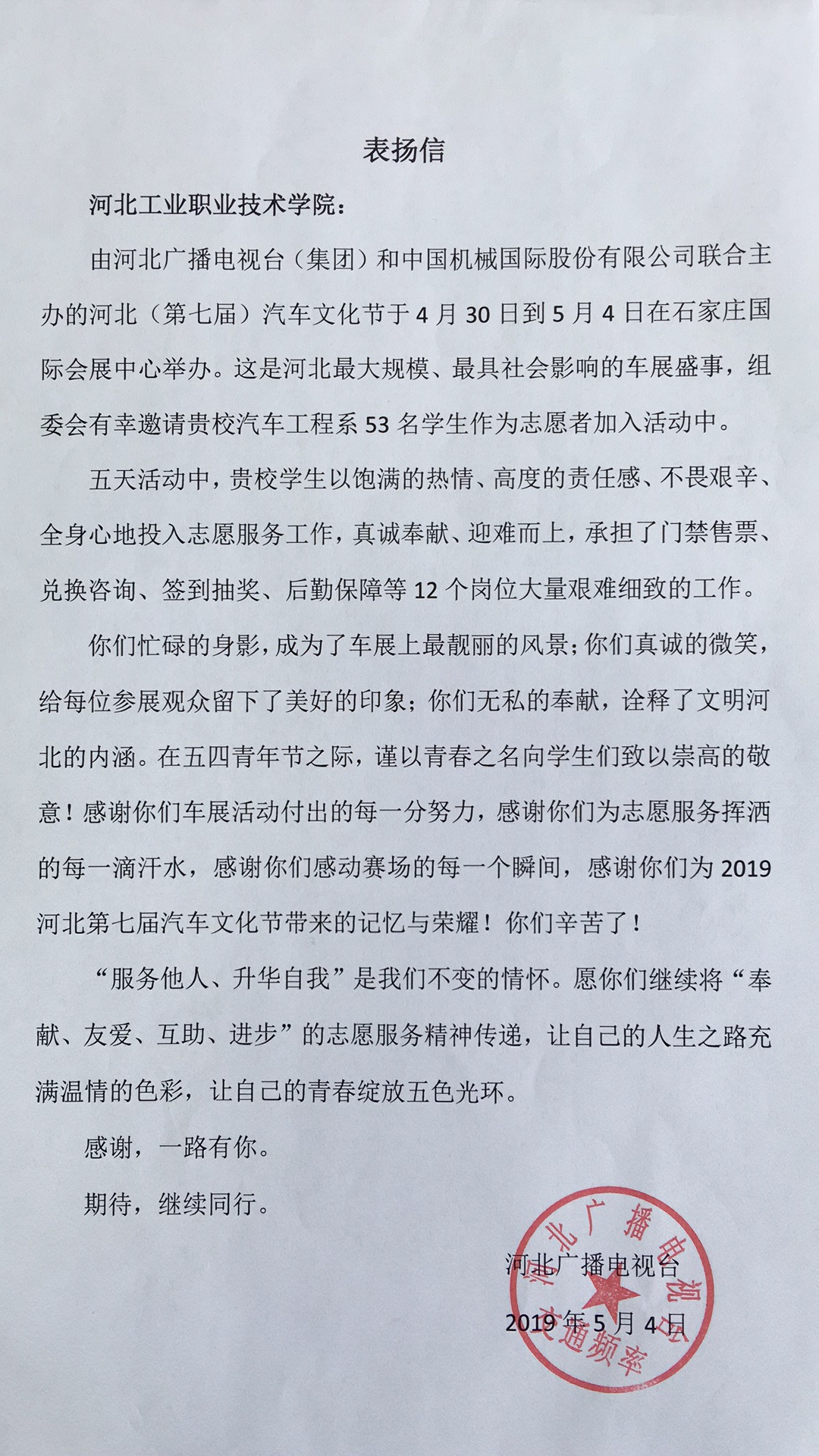 河北第七届汽车文化节是河北最大规模、最具社会影响的车展盛事。五天活动中,我院学生们用饱满的热情、高度的责任感、不畏艰辛、全身心地投入志愿服务工作,真诚奉献、迎难而上,承担了门禁售票、兑换咨询、签到抽奖、后勤保障等12个岗位大量艰难细致的工作。志愿者们忙碌的身影成为车展上最亮丽的风景线,无私的奉献,诠释了文明河北的内涵。活动结束后,我院学生收到了来自河北广播电台送来的表扬信。