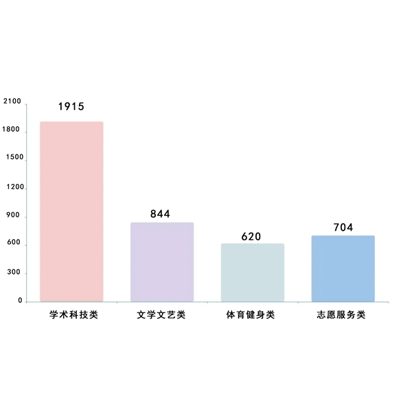 新生对学术科技类社团最感兴趣,有1915人报名加入,占纳新总数的44%;其次是文学文艺类社团,有844人报名加入,占纳新总数的20%。