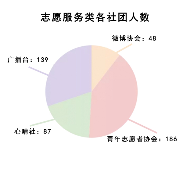 志愿服务类社团纳新总数排名前三的是青年志愿者协会、广播台、心晴社。