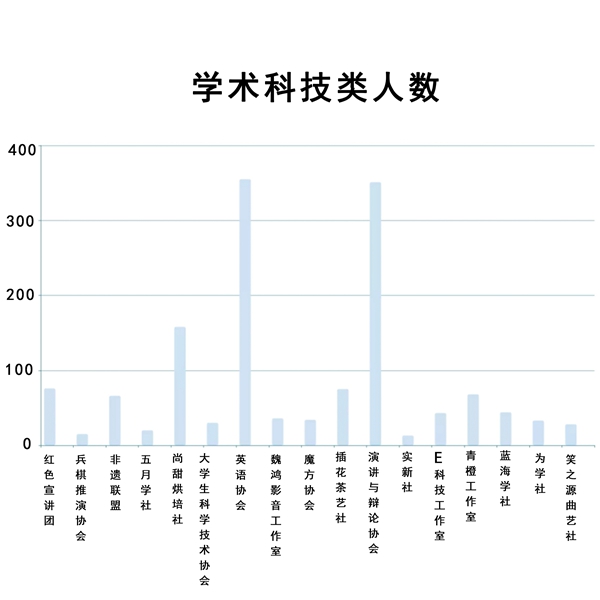 学术科技类社团纳新总数排名前三的是英语协会、演讲与辩论协会、尚甜烘焙社。